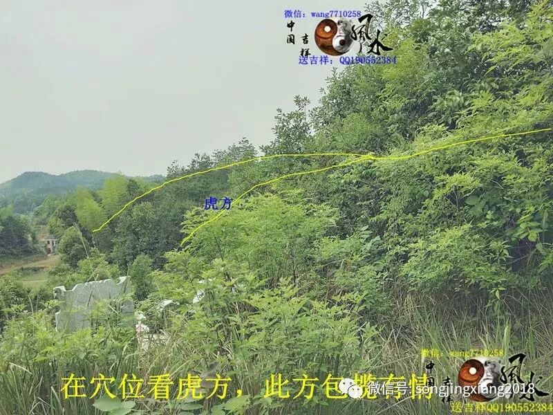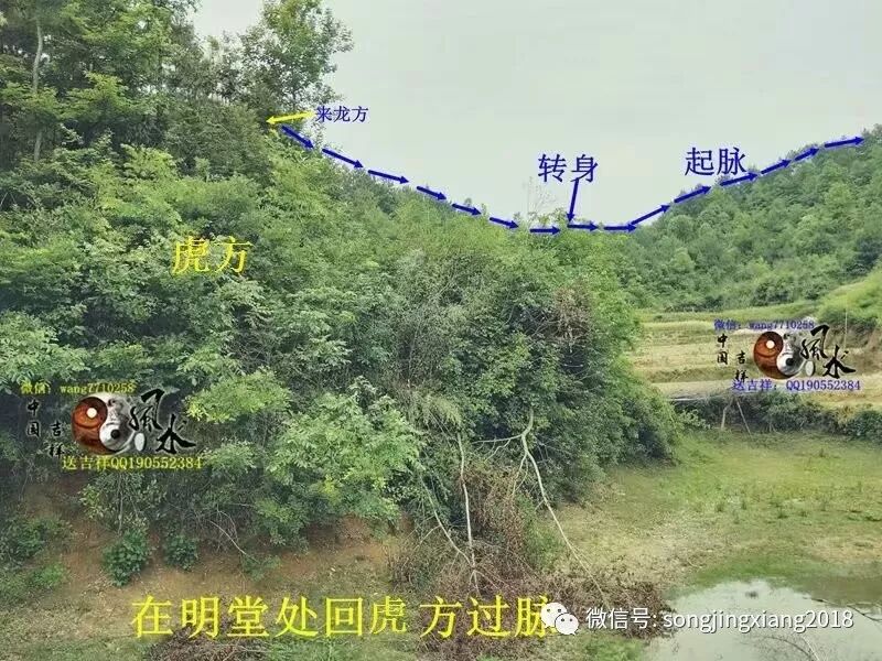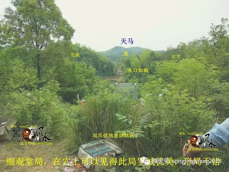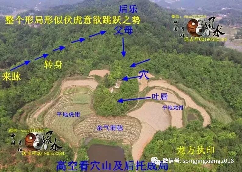 此地根据当地人描述,有人称谓之猛虎跳涧就在此,但也不少人称为大鹏展翅,但实地考察全局,实为猛虎跳涧为真也。此地来龙生猛,束咽有力,从少祖刀面山的巍峨山峰,突然下脉,急速短峡细束蜂腰入首,再突然急速起高顶,可谓龙不束咽龙不真,龙不起顶龙无力,此如此之急脉束咽起顶,可见此穴受气之巨大,起顶之后脉以T形起势,右拐作穴虎砂包揽城局,左拐行脉转身起再起父母土屏文诰,中抽下脉结成穴山,父母再弯环左转,开排牙成龙砂包揽成局,父母山再结后乐,经过上十重峰峦才顾水结穴,重重高起,形似虎身微略向上翘臂,龙虎砂低伏顾地,头部微伏而向上观望朝山,有如意欲伏地跳跃而起之势,而左右龙虎山夹拱成峡作涧,前有三层平案渐渐高起,一天马作朝,整个穴形形似 猛虎伏跳上案坐马之势,故称猛虎跳涧也。