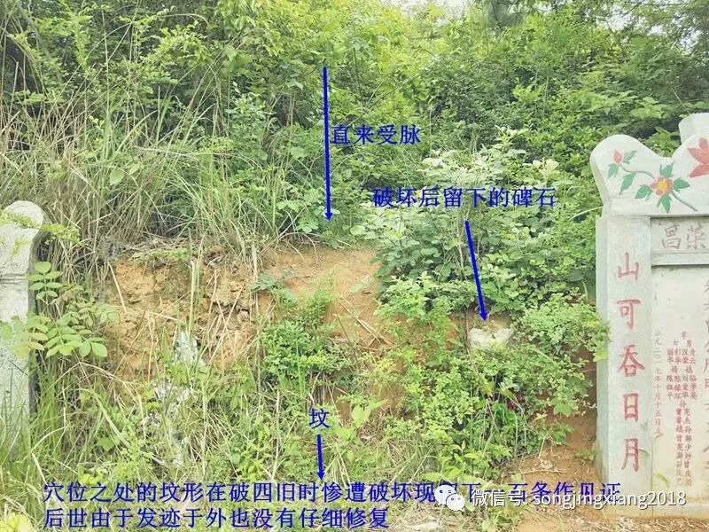 穴位之处,现在在地上只有棺木之土堆,墓形基本已经破坏,此是中国文化大革命时,惨遭破坏,至今后人没有对其修复,甚为可惜,只在穴上方留下有石条见证着当初的辉煌,左右均为曾姓之坟,但不知是否同系