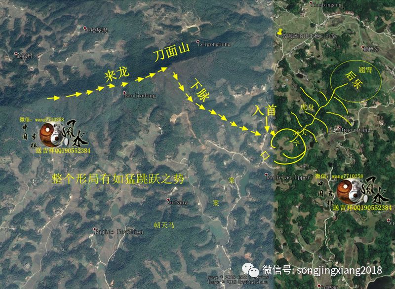 卫星地图可以看出,此少祖发脉下跌急速,但都层层开帐化煞脱气,束咽短小有力,整个穴山,后乐为老虎的屁股翘尾,中间如虎身,穴山如虎头,龙虎如虎爪伏地,前有三重由高至低的案,重重高起,整形局有如猛虎跳跃上朝驾马之势